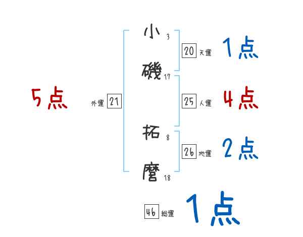 外運![]() | 小磯拓麿さんの外運は21画の5つ星!統率力がある。独立し成功する。名誉を手に入れる。 生活面を象徴する運勢です。外部から受ける影響力を表し、結婚運、家庭運や職場、環境への順応性を表します。 |