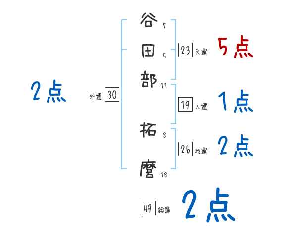 谷田部拓麿さんの画数の鑑定結果