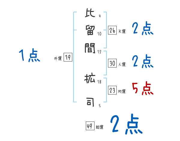 天運![]()  | 比留間拡司さんの天運は26画の2つ星!波瀾万丈かも。信頼できる人を大事にしましょう。 家系が持つ宿命的な運勢を表します。祖先から受け継いだ苗字ですので自分の力が及びません。家柄を象徴します。 |