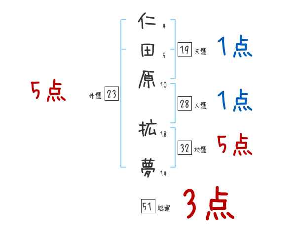 総運![]() | 仁田原拡夢さんの総運は51画の3つ星!変化が激しく、危険に注意。堅実な性格。 あなたの人生を表す1番重要な運勢です。生涯を通じて影響する総合運となり、主に50歳以降の晩年期に影響を及ぼします。 |