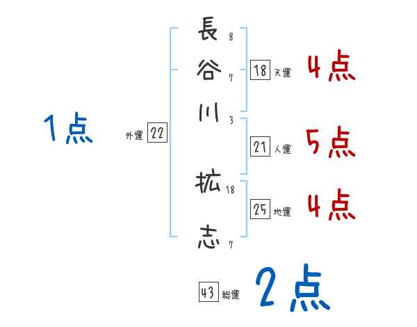 天運![]() | 長谷川拡志さんの天運は18画の4つ星!情熱的で剛気。忍耐力があり信頼される。 家系が持つ宿命的な運勢を表します。祖先から受け継いだ苗字ですので自分の力が及びません。家柄を象徴します。 |