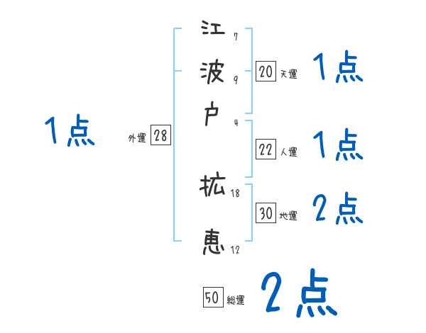 人運![]() | 江波戸拡恵さんの人運は22画の1つ星!努力することが苦手ないっぽう手先が器用。芸術性にも優れる。 性格や才能などを表す2番目に重要な運勢です。人間関係や協調性、社会的な成功に影響します。主に20歳から50歳ぐらいまでの中年期の運勢を表します。 |