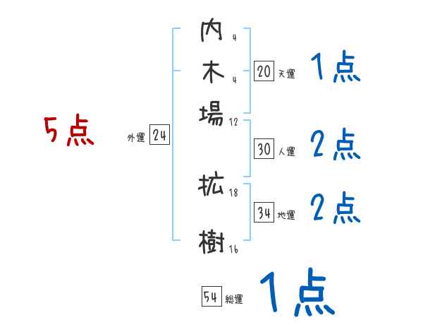 総運![]() | 内木場拡樹さんの総運は54画の1つ星!トラブルが多いかも。周りをよく見て協調して過ごしましょう。 あなたの人生を表す1番重要な運勢です。生涯を通じて影響する総合運となり、主に50歳以降の晩年期に影響を及ぼします。 |