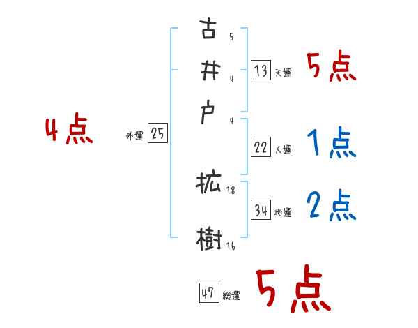 総運![]() | 古井戸拡樹さんの総運は47画の5つ星!実力が開花し発展する円満な人生。財に恵まれる。 あなたの人生を表す1番重要な運勢です。生涯を通じて影響する総合運となり、主に50歳以降の晩年期に影響を及ぼします。 |