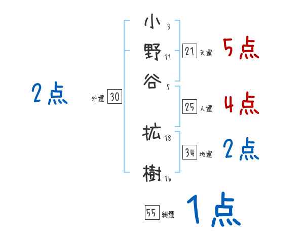 天運![]() | 小野谷拡樹さんの天運は21画の5つ星!統率力がある。独立し成功する。名誉を手に入れる。 家系が持つ宿命的な運勢を表します。祖先から受け継いだ苗字ですので自分の力が及びません。家柄を象徴します。 |