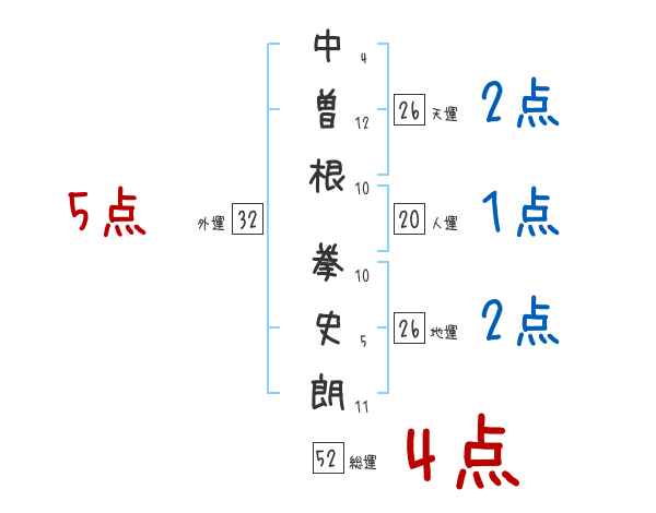 外運![]() | 中曽根拳史朗さんの外運は32画の5つ星!柔軟性があり成功する。チャンスが多く金運が良い。 生活面を象徴する運勢です。外部から受ける影響力を表し、結婚運、家庭運や職場、環境への順応性を表します。 |