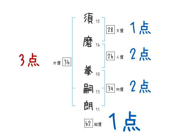 外運![]() | 須磨拳嗣朗さんの外運は36画の3つ星!先見性が豊かです。多少神経質で苦労することも。 生活面を象徴する運勢です。外部から受ける影響力を表し、結婚運、家庭運や職場、環境への順応性を表します。 |