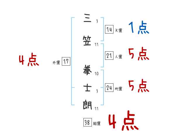 外運![]() | 三笠拳士朗さんの外運は17画の4つ星!積極的な行動力。地位を気づき財産を手に入れる。純粋な心と直感力。 生活面を象徴する運勢です。外部から受ける影響力を表し、結婚運、家庭運や職場、環境への順応性を表します。 |