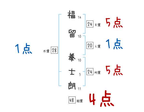 外運![]() | 福留拳士朗さんの外運は28画の1つ星!家庭環境に注意。スポーツで活躍できる能力があるかも。 生活面を象徴する運勢です。外部から受ける影響力を表し、結婚運、家庭運や職場、環境への順応性を表します。 |
