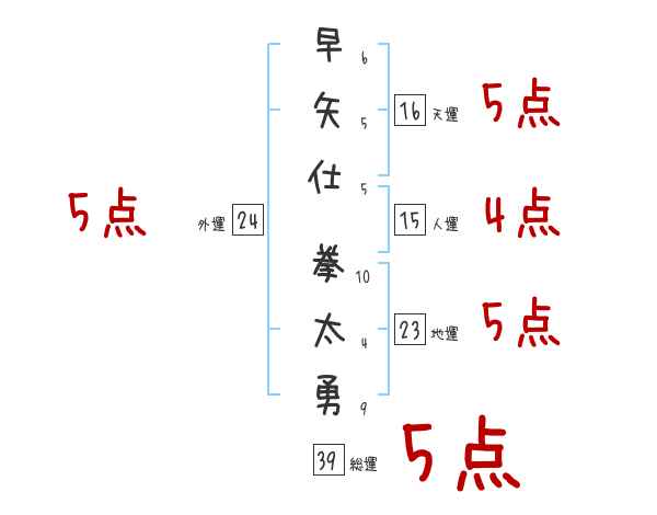 天運![]() | 早矢仕拳太勇さんの天運は16画の5つ星!人望が厚く大きく発展する。逆転成功が見える。 家系が持つ宿命的な運勢を表します。祖先から受け継いだ苗字ですので自分の力が及びません。家柄を象徴します。 |