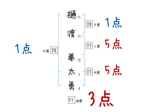 人運![]() | 樋渡拳太勇さんの人運は23画の5つ星!想像力に優れ活力がある。一代で成功し名誉を手に入れる。 性格や才能などを表す2番目に重要な運勢です。人間関係や協調性、社会的な成功に影響します。主に20歳から50歳ぐらいまでの中年期の運勢を表します。 |