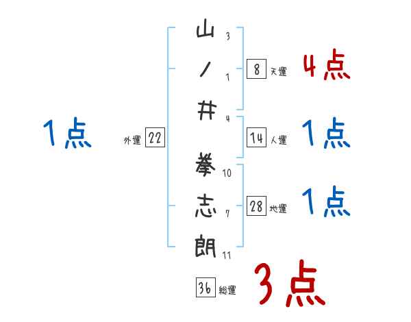 外運![]() | 山ノ井拳志朗さんの外運は22画の1つ星!努力することが苦手ないっぽう手先が器用。芸術性にも優れる。 生活面を象徴する運勢です。外部から受ける影響力を表し、結婚運、家庭運や職場、環境への順応性を表します。 |