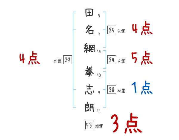 総運![]() | 田名網拳志朗さんの総運は53画の3つ星!やや見栄っ張りで虚栄心がある。散財に注意。 あなたの人生を表す1番重要な運勢です。生涯を通じて影響する総合運となり、主に50歳以降の晩年期に影響を及ぼします。 |