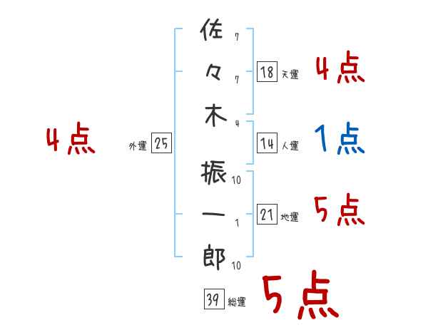 総運![]() | 佐々木振一郎さんの総運は39画の5つ星!社交性に優れ人望が厚い。人の上に立ち成功する。 あなたの人生を表す1番重要な運勢です。生涯を通じて影響する総合運となり、主に50歳以降の晩年期に影響を及ぼします。 |