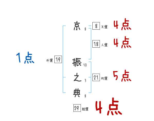 天運![]() | 京振之典さんの天運は8画の4つ星!勤勉家。根気強く努力し成功する。忍耐力がある。 家系が持つ宿命的な運勢を表します。祖先から受け継いだ苗字ですので自分の力が及びません。家柄を象徴します。 |