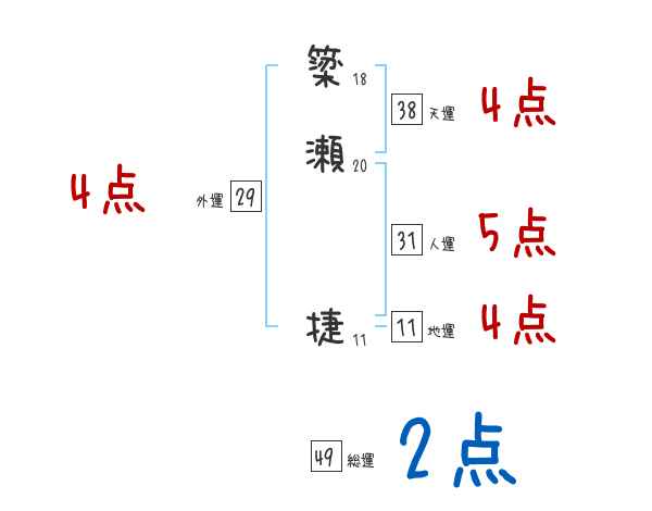 天運![]() | 簗瀬捷さんの天運は38画の4つ星!温厚な性格で技術的な才能を発揮する。職人的な仕事に向いている。 家系が持つ宿命的な運勢を表します。祖先から受け継いだ苗字ですので自分の力が及びません。家柄を象徴します。 |