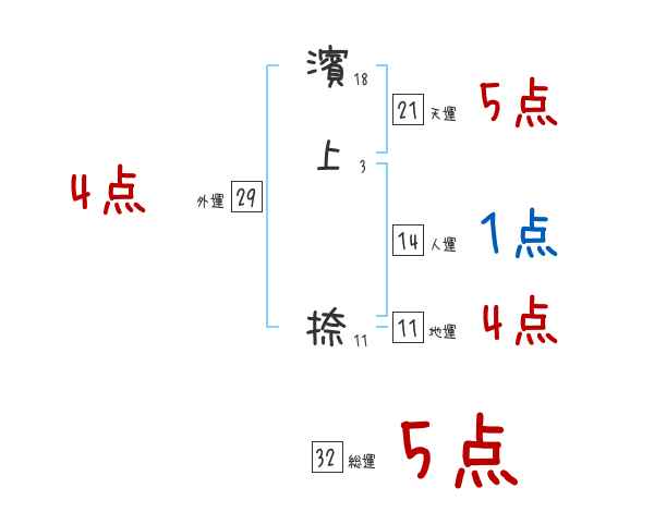 総運![]() | 濱上捺さんの総運は32画の5つ星!柔軟性があり成功する。チャンスが多く金運が良い。 あなたの人生を表す1番重要な運勢です。生涯を通じて影響する総合運となり、主に50歳以降の晩年期に影響を及ぼします。 |