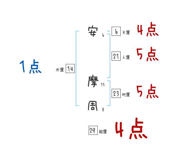 天運![]() | 安摩周さんの天運は6画の4つ星!慎重な努力家で信頼を得る。誠実な精神で向上心に優れる。 家系が持つ宿命的な運勢を表します。祖先から受け継いだ苗字ですので自分の力が及びません。家柄を象徴します。 |