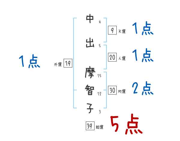 総運![]() | 中出摩智子さんの総運は39画の5つ星!社交性に優れ人望が厚い。人の上に立ち成功する。 あなたの人生を表す1番重要な運勢です。生涯を通じて影響する総合運となり、主に50歳以降の晩年期に影響を及ぼします。 |