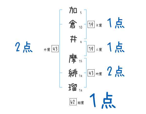 外運![]() | 加倉井摩緋瑠さんの外運は43画の2つ星!頑固な性格で独立心が強いかも。やや非現実的で浪費に注意しましょう。 生活面を象徴する運勢です。外部から受ける影響力を表し、結婚運、家庭運や職場、環境への順応性を表します。 |