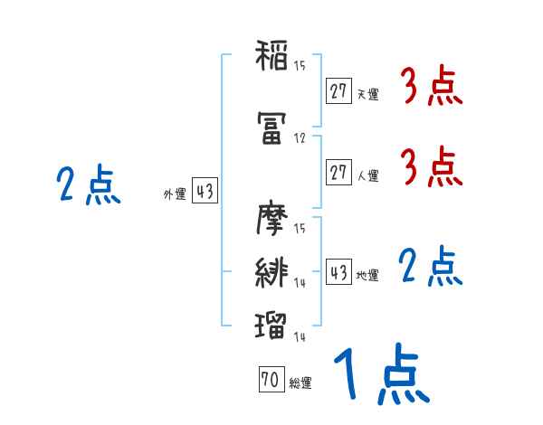 天運![]() | 稲冨摩緋瑠さんの天運は27画の3つ星!頭脳明晰だが強情で摩擦が多い傾向。孤立に注意。 家系が持つ宿命的な運勢を表します。祖先から受け継いだ苗字ですので自分の力が及びません。家柄を象徴します。 |