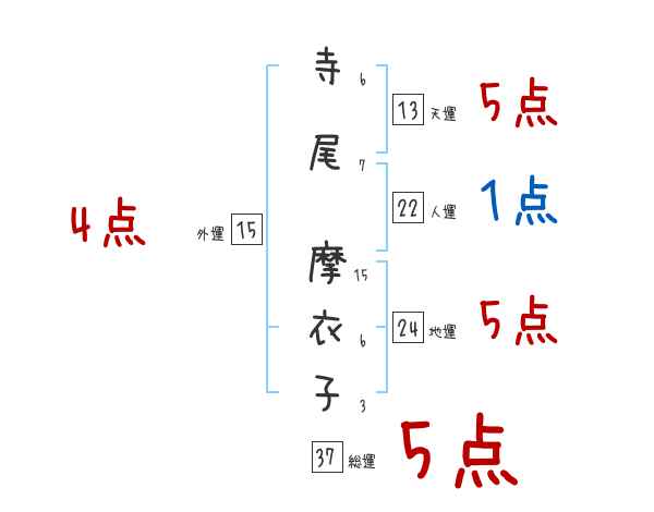 天運![]() | 寺尾摩衣子さんの天運は13画の5つ星!才能に恵まれ人気がある。名声を手に入れる。円満な人生。 家系が持つ宿命的な運勢を表します。祖先から受け継いだ苗字ですので自分の力が及びません。家柄を象徴します。 |