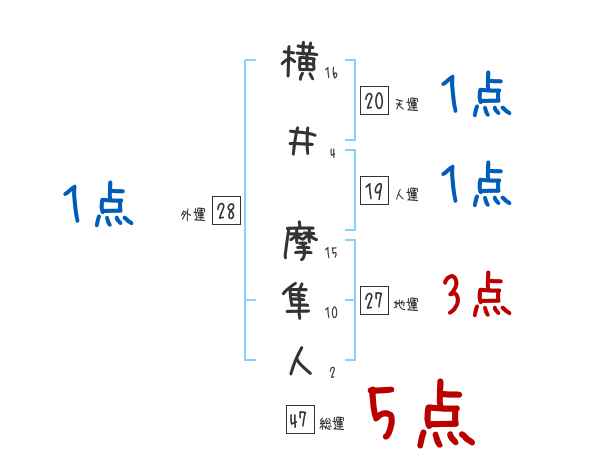 外運![]() | 横井摩隼人さんの外運は28画の1つ星!家庭環境に注意。スポーツで活躍できる能力があるかも。 生活面を象徴する運勢です。外部から受ける影響力を表し、結婚運、家庭運や職場、環境への順応性を表します。 |