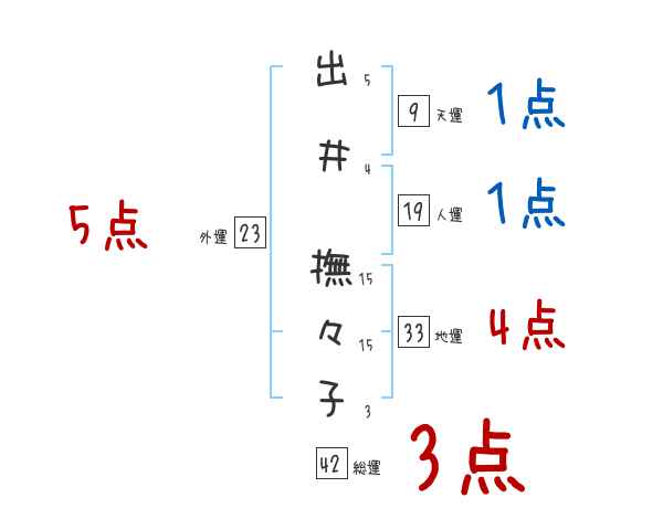 天運![]() | 出井撫々子さんの天運は9画の1つ星!消極的で才能を発揮することが苦手なことも。周りの意見に耳を傾けましょう。 家系が持つ宿命的な運勢を表します。祖先から受け継いだ苗字ですので自分の力が及びません。家柄を象徴します。 |