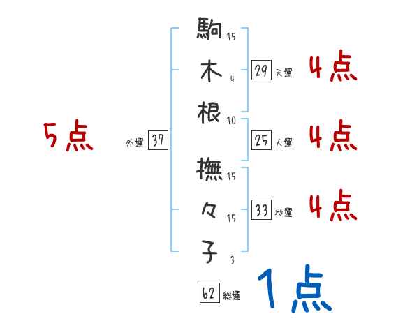 地運![]() | 駒木根撫々子さんの地運は33画の4つ星!権力志向でプライドが高い。勇気があり運を切り開き成功する。 個性を表す基礎的な運勢です。性格形成や対人関係、行動力など家庭環境に影響されます。主に誕生してから20歳くらいまでの若年期の運勢を表します。 |