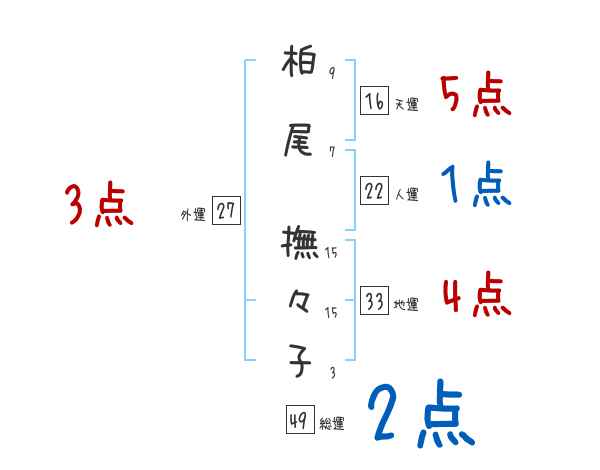 外運![]() | 柏尾撫々子さんの外運は27画の3つ星!頭脳明晰だが強情で摩擦が多い傾向。孤立に注意。 生活面を象徴する運勢です。外部から受ける影響力を表し、結婚運、家庭運や職場、環境への順応性を表します。 |