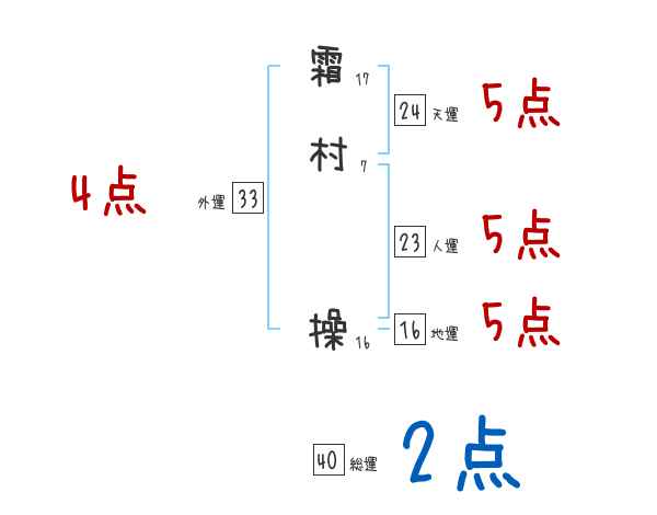 天運![]() | 霜村操さんの天運は24画の5つ星!家庭運が良く順調な人生。金運にも恵まれる。 家系が持つ宿命的な運勢を表します。祖先から受け継いだ苗字ですので自分の力が及びません。家柄を象徴します。 |