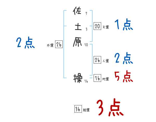 外運![]() | 佐土原操さんの外運は26画の2つ星!波瀾万丈かも。信頼できる人を大事にしましょう。 生活面を象徴する運勢です。外部から受ける影響力を表し、結婚運、家庭運や職場、環境への順応性を表します。 |
