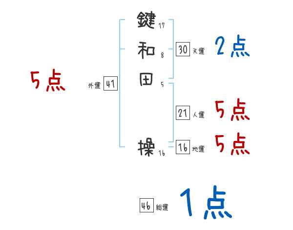 天運![]() | 鍵和田操さんの天運は30画の2つ星!浮き沈みの激しさに注意しましょう。 家系が持つ宿命的な運勢を表します。祖先から受け継いだ苗字ですので自分の力が及びません。家柄を象徴します。 |