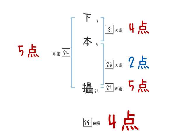 外運![]() | 下本攝さんの外運は24画の5つ星!家庭運が良く順調な人生。金運にも恵まれる。 生活面を象徴する運勢です。外部から受ける影響力を表し、結婚運、家庭運や職場、環境への順応性を表します。 |