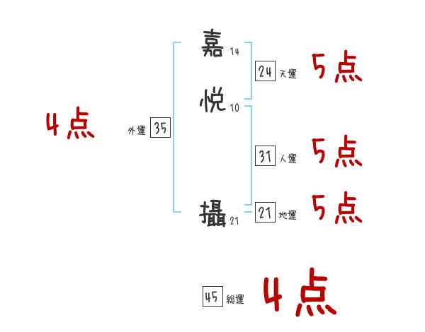 総運![]() | 嘉悦攝さんの総運は45画の4つ星!もくもくと物事を進め達成する。地味な努力家。 あなたの人生を表す1番重要な運勢です。生涯を通じて影響する総合運となり、主に50歳以降の晩年期に影響を及ぼします。 |