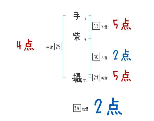 天運![]() | 手柴攝さんの天運は13画の5つ星!才能に恵まれ人気がある。名声を手に入れる。円満な人生。 家系が持つ宿命的な運勢を表します。祖先から受け継いだ苗字ですので自分の力が及びません。家柄を象徴します。 |