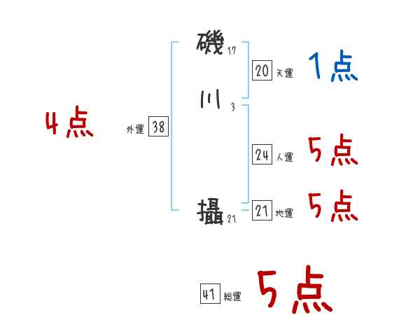 総運![]() | 磯川攝さんの総運は41画の5つ星!大志を抱き、目標に向かって実力を発揮し達成する。温和な性格。 あなたの人生を表す1番重要な運勢です。生涯を通じて影響する総合運となり、主に50歳以降の晩年期に影響を及ぼします。 |