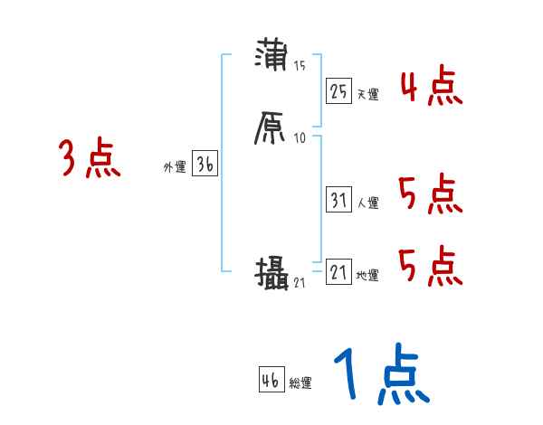 総運![]() | 蒲原攝さんの総運は46画の1つ星!迷走することが多く苦労するかも。目先のことにとらわれないように。 あなたの人生を表す1番重要な運勢です。生涯を通じて影響する総合運となり、主に50歳以降の晩年期に影響を及ぼします。 |