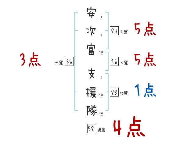 人運![]() | 安次富支援隊さんの人運は16画の5つ星!人望が厚く大きく発展する。逆転成功が見える。 性格や才能などを表す2番目に重要な運勢です。人間関係や協調性、社会的な成功に影響します。主に20歳から50歳ぐらいまでの中年期の運勢を表します。 |