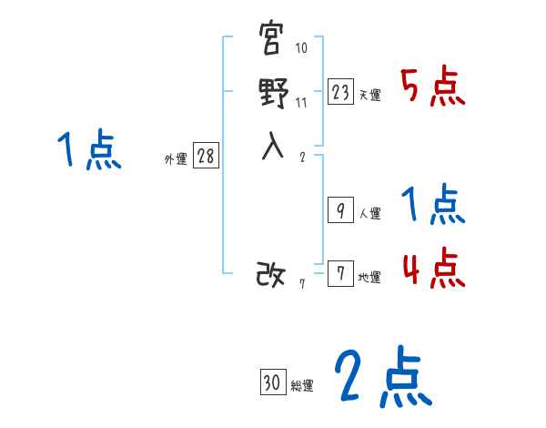 総運![]() | 宮野入改さんの総運は30画の2つ星!浮き沈みの激しさに注意しましょう。 あなたの人生を表す1番重要な運勢です。生涯を通じて影響する総合運となり、主に50歳以降の晩年期に影響を及ぼします。 |