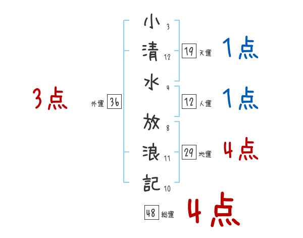 天運![]() | 小清水放浪記さんの天運は19画の1つ星!優れた才能を持ちますが、協調性が足りないことも。周りの人と協力する事を意識しましょう。 家系が持つ宿命的な運勢を表します。祖先から受け継いだ苗字ですので自分の力が及びません。家柄を象徴します。 |