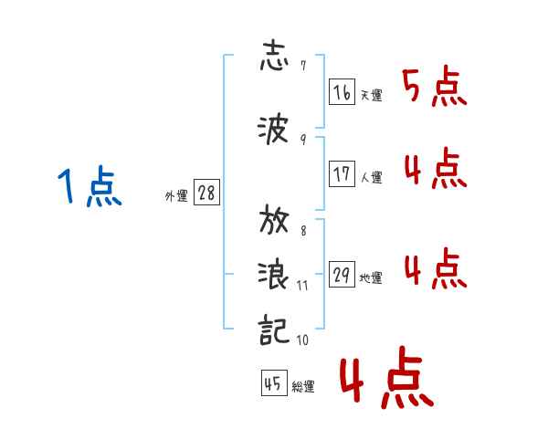 天運![]() | 志波放浪記さんの天運は16画の5つ星!人望が厚く大きく発展する。逆転成功が見える。 家系が持つ宿命的な運勢を表します。祖先から受け継いだ苗字ですので自分の力が及びません。家柄を象徴します。 |