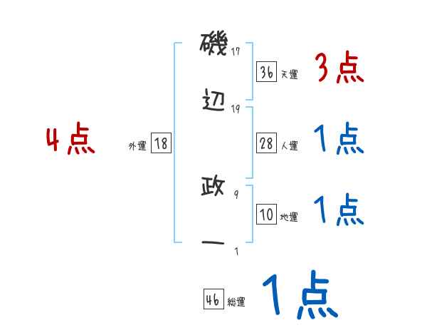 外運![]() | 磯辺政一さんの外運は18画の4つ星!情熱的で剛気。忍耐力があり信頼される。 生活面を象徴する運勢です。外部から受ける影響力を表し、結婚運、家庭運や職場、環境への順応性を表します。 |