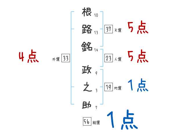 地運![]() | 根路銘政之助さんの地運は19画の1つ星!優れた才能を持ちますが、協調性が足りないことも。周りの人と協力する事を意識しましょう。 個性を表す基礎的な運勢です。性格形成や対人関係、行動力など家庭環境に影響されます。主に誕生してから20歳くらいまでの若年期の運勢を表します。 |