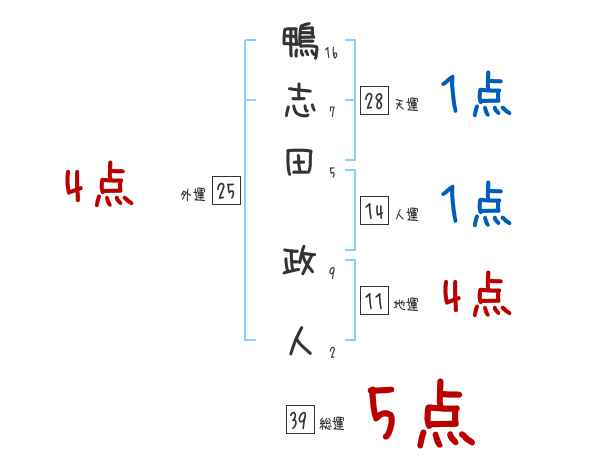 総運![]() | 鴨志田政人さんの総運は39画の5つ星!社交性に優れ人望が厚い。人の上に立ち成功する。 あなたの人生を表す1番重要な運勢です。生涯を通じて影響する総合運となり、主に50歳以降の晩年期に影響を及ぼします。 |