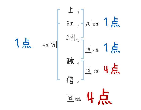 人運![]() | 上江洲政信さんの人運は19画の1つ星!優れた才能を持ちますが、協調性が足りないことも。周りの人と協力する事を意識しましょう。 性格や才能などを表す2番目に重要な運勢です。人間関係や協調性、社会的な成功に影響します。主に20歳から50歳ぐらいまでの中年期の運勢を表します。 |