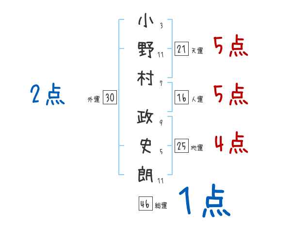 人運![]() | 小野村政史朗さんの人運は16画の5つ星!人望が厚く大きく発展する。逆転成功が見える。 性格や才能などを表す2番目に重要な運勢です。人間関係や協調性、社会的な成功に影響します。主に20歳から50歳ぐらいまでの中年期の運勢を表します。 |