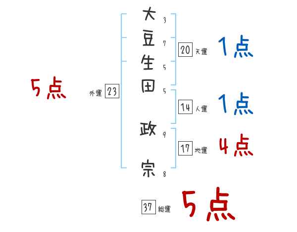 総運![]() | 大豆生田政宗さんの総運は37画の5つ星!努力家で順応性に優れる。現実的な考え方ができ忠実に物事をこなす。 あなたの人生を表す1番重要な運勢です。生涯を通じて影響する総合運となり、主に50歳以降の晩年期に影響を及ぼします。 |