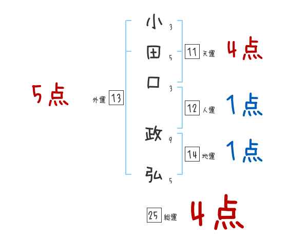 天運![]() | 小田口政弘さんの天運は11画の4つ星!着実に富や地位を得る幸運な人生。 家系が持つ宿命的な運勢を表します。祖先から受け継いだ苗字ですので自分の力が及びません。家柄を象徴します。 |