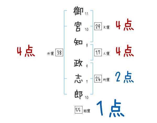 天運![]() | 御宮知政志郎さんの天運は29画の4つ星!完全主義で才能がある。厳格な心の持ち主。 家系が持つ宿命的な運勢を表します。祖先から受け継いだ苗字ですので自分の力が及びません。家柄を象徴します。 |